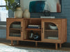 Details Made with solid acacia wood, Back made with acacia veneer and engineered wood substrate, Natural finish, Metal door pulls with black finish, 2 doors with half-arch patterns and fluted glass inserts, 3 removable shelves, Openings in back for electronics, Assembly required