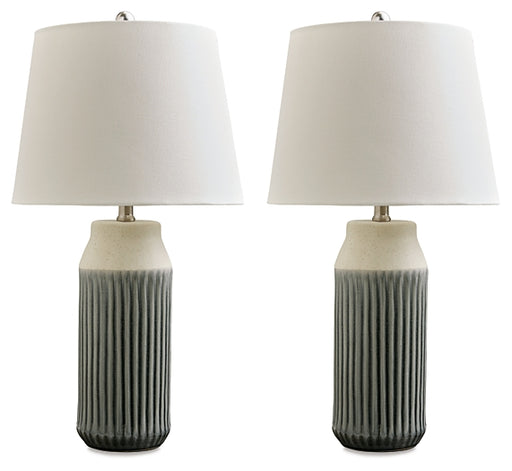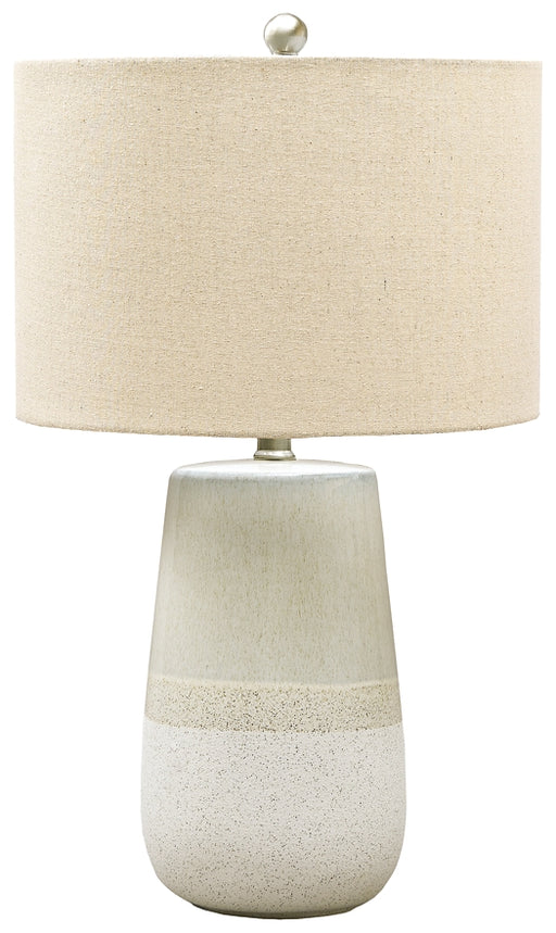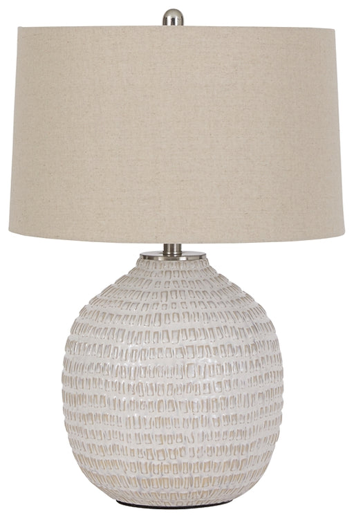 Signature Design by Ashley®With a textured neutral glaze, this monochromatic table lamp brings thoughts of sun, surf and sand to your space. Turn coastal chic to the contempo...