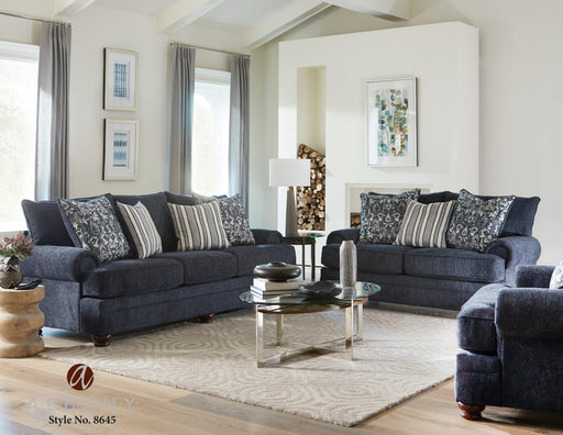 AlbanyThe Albany Industries Abbott Indigo set features rolled arms and wooden feet with a dark brown finish. Adopt a comforting and classy look in your l...