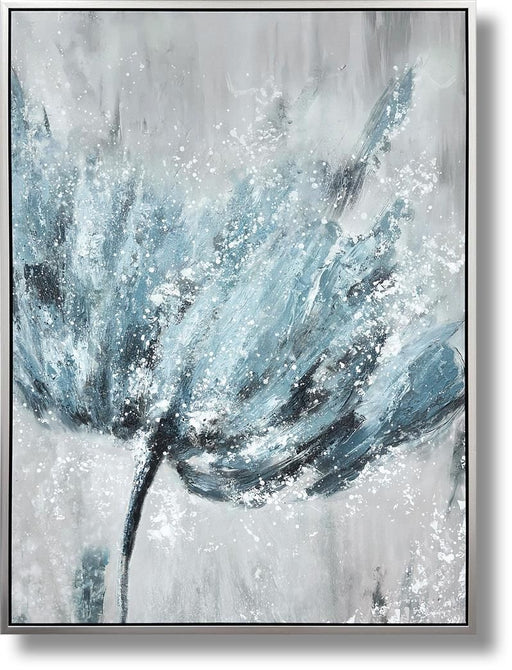 Classy Living“Frosted Blue Petal Burst” is a captivating hand-painted oil painting on canvas that brings a serene floral burst to your living space. Featuring d...