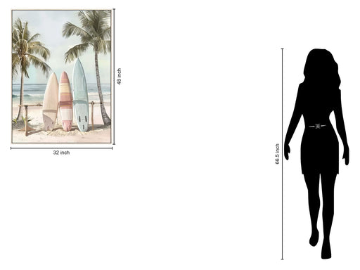 Classy Living“Surfside” captures the serene beauty of a coastal morning with three surfboards resting against a makeshift rack between palm trees. This hand-pai...