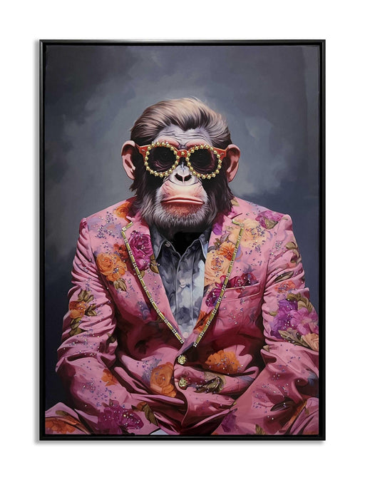 Classy LivingThis captivating "Pink Suit Chimp" graphic art piece features a chimpanzee dressed in a vibrant pink floral suit, adorned with hand-applied studs t...
