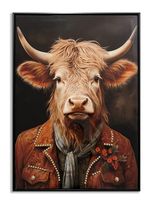 Classy LivingThis striking "Bull in Black Leather - Gloss Canvas" piece captures a majestic bull adorned in a studded leather jacket with exquisite detail and a...