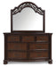 Details B764B10: Includes poster headboard/footboard panels, rails and headboard posts, Made with hardwood solids, cherry veneer with MDF substrates, decorative cast resin and furniture grade plastic components , Cherry brown finish, Headboard with metallic accent filigree, Foundation/box spring required, sold separately, Mattress available, sold separately, Assembly required, B764B1: Includes dresser and mirror, Made with hardwood solids, cherry veneer with MDF substrates, decorative cast resin and furniture grade plastic components , Cherry brown finish, Decorative metal drawer pulls with dark bronze-tone finish, 7 drawers with fully finished interior, dovetail construction and ball-bearing side glides, Mirror attaches to back of dresser, B764-46: Made with hardwood solids, cherry veneer with MDF substrates, decorative cast resin and furniture grade plastic components, Cherry brown finish, Decorative metal drawer pulls with dark bronze-tone finish, 5 drawers with fully finished interior, dovetail construction and ball-bearing side glides, B764-93: Made with hardwood solids, cherry veneer with MDF substrates, decorative cast resin and furniture grade plastic components, Cherry brown finish, Decorative metal drawer pulls with dark bronze-tone finish, 2 drawers with fully finished interior, dovetail construction and ball-bearing side glides, Pull-out tray behind bottom drawer,