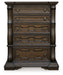 Details B947B10: Includes upholstered poster headboard panel, poster footboard panel, rails, slats, posts and canopy , Made with hardwood solids, oak veneer, MDF substrates and cast resin components, Dark brown finish, Metal canopy, Foam headboard cushion with polyester upholstery, Measure room, including ceiling height, to ensure bed clears fans and light fixtures, Foundation/box spring required, sold separately, Mattress available, sold separately, Assembly required, B947B1: Includes dresser and mirror, Made with hardwood solids, oak and ash swirl veneers, MDF substrates and cast resin components, Dark brown finish, 6 smooth-gliding drawers with dovetail construction (top drawer felt lined), Drawer pulls with antiqued goldtone finish, Mirror attaches to back of dresser, B947-46: Made with hardwood solids, oak and ash swirl veneers, MDF substrates and cast resin components, Dark brown finish, 5 smooth-gliding drawers with dovetail construction (top drawer felt lined), Drawer pulls with antiqued goldtone finish, B947-93: Made with hardwood solids, oak and ash swirl veneers, MDF substrates and cast resin components, Dark brown finish, 2 smooth-gliding drawers with dovetail construction (top drawer felt lined), Pull-out tray behind bottom drawer, Drawer pulls with antiqued goldtone finish, 110V power supply with dual USB charging ports, Power cord included; UL Listed,