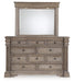 | Details | B916B4: Includes panel headboard, footboard with slats and rails, Made with hardwood solids, oak and ash veneer, cast resin components and engineered wood substrates, Tops with inlaid ash veneer border, Light warm grayish brown glazed wood finish, Breakfront pilasters, Inset picture frame panels, Headboard features light bridge with 2 overhead LED lights, Foundation/box spring required, sold separately , Mattress available, sold separately, Assembly required, B916B1: Includes dresser and mirror, Made with hardwood solids, oak and ash veneer, cast resin components and engineered wood substrates, Tops with inlaid ash veneer border, Light warm grayish brown glazed wood finish, Round metal knobs with satin nickel-tone finish, 10 drawers with fully finished interior, dovetail construction and ball-bearing side glides, Drawers with inset framed fronts, Dresser with breakfront pilasters, Mirror frame features light bridge with 2 mini LED lights, Mirror attaches to back of dresser, | |