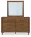 | Details | B615B6: Includes upholstered panel headboard and footboard , Solid wood frame, Due to the use of natural wood materials, some variations may occur , Frame with medium brown wood tone finish, Polyester upholstery, Tapered legs, Foundation/box spring required, sold separately , Mattress available, sold separately, Assembly required, B615B1: Includes dresser and mirror, Made with hardwood solids, mango wood veneer and MDF substrates, Medium brown wood-tone finish, 6 drawers with fully finished interior, dovetail construction and heavy duty ball-bearing side glides, Round tapered legs, Mirror attaches to back of dresser, B615-92: Made with hardwood solids, mango wood veneer and MDF substrates, Medium brown wood-tone finish, 2 drawers with fully finished interior, dovetail construction and heavy duty ball-bearing side glides, Round tapered legs, 110V power supply with USB-A and USB-C charging ports, Power cord included; UL Listed, | |