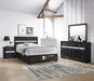 This bedroom set offers a sophisticated and cohesive look with its dark-toned wood and elegant design. The bed stands out with a high headboard featuring a shimmering silver accent, giving it a luxurious feel. The set includes a bed with storage drawers at the footboard, ideal for extra linens or out-of-season clothing, enhancing the functionality of the space. Matching pieces consist of a nightstand, chest, and a dresser with a variety of drawer sizes for optimal organization.
