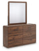 | Details | Includes dresser and mirror, Made with MDF substrates and decorative paper laminate, Replicated walnut wood grain with high-low contrast for a rich brown wood tone, Hardware with black finish, 6 smooth-gliding drawers with English dovetail construction and center mount drawer guides (top drawers felt lined), Drawer interiors lined with decorative wood grain paper laminate, Mirror attaches to back of dresser | |