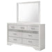 Bring sophisticated grace to your bedroom with this chic dresser, designed to lend an elegant touch to your personal sanctuary. Its felt-lined drawers offer safekeeping for delicate belongings, while the hidden jewelry drawer provides a discreet space for your treasures. The glittery panel across the front sparkles with opulence, enhancing the dresser's allure. Complementing the piece is the cheerful mirror, whose linear design and framed construction add a stylish ambiance. Choose from various finishes to perfectly round out your bedroom's design scheme.