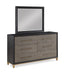 This bedroom ensemble exudes a sleek, contemporary charm with a hint of mid-century flair, perfect for creating a tranquil yet stylish retreat. The centerpiece, a bed with an upholstered headboard, is framed with a contrasting dark trim, offering a plush backdrop for rest and relaxation. Accompanying the bed are streamlined nightstands and a dresser, all featuring a rich, dark wood finish with brushed gold hardware, adding a touch of elegance and sophistication. The furniture sits on tapered legs, providing a light, lifted look that complements the modern aesthetic.