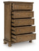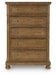 | Details | Made with poplar solids, pine veneer and MDF substrate, Chestnut brown wood-tone finish, Metal knobs with aged pewter-tone finish, 5 smooth-gliding drawers with fully finished interiors, English dovetail construction and heavy-duty ball-bearing side glides (top drawer felt lined) | |