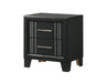 This elegant bedroom collection presents a sophisticated ensemble perfect for creating a refined modern aesthetic in your sleeping quarters. The suite features a sleek, minimalist design with crisp, clean lines and a rich finish that exudes contemporary charm. Anchoring the set is a robust panel bed with a prominent headboard, promising a sturdy and stylish centerpiece. Flanking the bed are complementary case pieces, offering ample storage with their smooth-gliding drawers accented with chic silver-toned hardware.