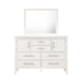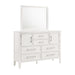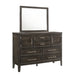 The Andover 2-Piece Wood Dresser and Mirror Set offers a blend of durability, style, and functionality, making it an ideal addition to any bedroom. This set includes a dresser and a matching mirror, both expertly crafted from solid Rubberwood, manufactured woods, and wood veneers, ensuring long-lasting durability while showcasing the natural beauty of real wood. The rich Nutmeg Brown finish is achieved through a meticulous multi-step process, featuring sand-throughs and white glazing, which imparts a sophisticated, weathered appeal, highlighting the unique grains and characteristics of the wood. The Andover collection’s clean lines and modern rustic style are complemented by sleek, elongated metallic handles that provide a sophisticated contrast to the warm, dark wood finish. The framed drawer fronts add depth and dimension, while the sturdy block-style legs ensure a solid and stable foundation. The drawers glide smoothly on robust Kenlin drawer glides and feature dovetail joinery, a testament to superior craftsmanship. The set is completed by the pristine, low-distortion beveled glass mirror, encased in picture frame-style moldings that offer a clean, elegant look, enhancing any space with timeless sophistication.
