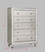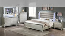 Elevate your sanctuary with this dazzling bedroom collection, where contemporary chic meets timeless charm. The suite boasts a stunning silver finish, imbuing your space with an air of sophistication and modern luxury. At the heart lies a plush, channel tufted bed that invites you to indulge in comfort, highlighted by integrated LED lighting. Ample storage solutions are provided through sleek, lined dressers and nightstands, where functionality meets finesse.