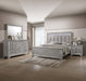 This elegant bedroom suite combines timeless design with contemporary appeal. The soft finish offers a modern twist on classic styling, with integrated LED lighting on the tufted headboard adding a luxurious focal point. The collection includes a bed, nightstands, a dresser, and a mirror, all featuring refined detailing and silver-toned hardware that exudes sophistication. Each piece showcases a distinct wood grain pattern, enhancing the suite's upscale charm. The dresser and nightstand provide generous storage, with smooth-gliding drawers that cater to a seamless organization.