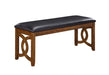 Complete your dining set or add extra seating in your home with the New Classic Furniture Gia Upholstered Dining Bench, a versatile and stylish addition to your space. Crafted from solid Rubberwood and Mindi veneers, this bench offers both durability and timeless beauty. The finish, achieved through a multistep process and clear coat, accentuates the natural wood grain. Providing comfortable extra seating, the bench features a black PU upholstered cushion supported by solid wood legs. The distinctive transitional style is characterized by interlocking chain bench base supports, tapered legs, and clean lines. Assembly is straightforward with all necessary hardware and clear instructions included. Backed by a one-year warranty, this Gia Upholstered Dining Bench ensures both practicality and style for your home.