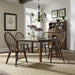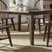 Wow family and friends with the Hearthstone Ridge rectangular table set. Crafted of rubberwood solids and oak veneers, this set features a tobacco and black finish and consists of the rectangular leg table and four Windsor back side chairs. The leg table has a planked top with canted corners and includes two 18” removable leaves that creates a grand scale. Wood and peg accents add to a craftsman feel. The table is anchored by thick tapered legs. The Windsor back side chairs are known for their comfort and durability. They feature a black finish, a saddle shaped seat for added comfort, and splayed legs with nylon chair glides to protect your flooring. Hearthstone Ridge is a casual, rustic style that never goes out of fashion.