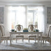 Create a grand gathering with the Magnolia Manor table set, consisting of upholstered splat back side chairs and a rectangular leg table. Crafted of poplar solids with cathedral white oak veneer, this kit features an antique white finish with heavy chipping and a weathered brown top with whitewash. The table offers a fancy face top, canted corners, two 18" leaves to easily accommodate guests or a large family and is anchored by faceted turned legs. The chairs feature the perfect blend of European design with upholstery in ivory tweed chenille, dog bone accents on the splat back, tufted back panel, nylon chair glides to protect your flooring, and beautifully faceted turned legs. Warm antique finishes and artistic distressing along with grand scale create a piece to be passed to generations.