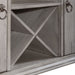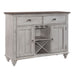 Warm and cozy. Bring beauty indoors with the Ocean Isle buffet. Crafted of rubberwood solids and New Zealand pine veneers this piece features a two-tone finish with a natural pine top, accented with satin nickel cup pull and ring hardware. There are two felt lined top drawers, an open center shelf with wine bottle storage and glass stemware holders, flanked by two wood framed planked doors. Behind each door is one adjustable shelf. The tranquility of the sea and the charm of a cozy cottage harmonize in the Ocean Isle buffet.