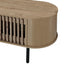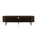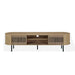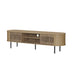 The Brax 70" TV Console with Sliding Doors combines sturdy, eco-friendly construction with ample storage and modern style. Crafted from manufactured wood and covered in durable, environmentally friendly decorative laminate, this console is not only sleek but also sustainable. With its 71" width, it offers plenty of space on top to accommodate large-screen televisions. The sliding tambor doors not only conceal components but also reveal decorative storage space, allowing for both practicality and aesthetics. Its mid-century modern appeal is enhanced by black metal legs and rounded edges, giving it a contemporary touch. The tambor-style doors further add character and distinction to the design. The natural beige finish adds warmth and versatility, complementing a variety of décors. Whether your style is modern, transitional, or eclectic, this console is sure to enhance your living space with its combination of storage and style.