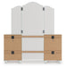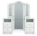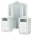 Details Includes 2 vanity cabinets and vanity mirror, Made with engineered wood (MDF/particleboard/plywood) and decorative laminate for the right balance of affordability and durability , Matte white finish, Decorative laminate replicates natural or man-made material surfaces with consistent color, pattern and texture , Crystal drawer knobs, 4 smooth-gliding drawers (2 in each cabinet); drawer interiors are lined with a faux linen laminate for a clean, finished look, Open shelf in each cabinet, Glass insert , Mirror features ambient white LED lighting with brightness options, Safety is a top priority, clothing storage units are designed to meet the most current standards for stability, ATM F 2057 (ASTM International), Drawers extend out to accommodate maximum access to drawer interior while maintaining safety, Power cord included; UL Listed, Minor assembly required