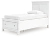 | Details | Includes panel headboard, storage footboard, rails and roll slats , Made with hardwood solids and MDF substrate, Side rails feature laminated solid hardwood slat support rails (or LVL) with glued and screwed blocking for added strength , White painted finish, Round metal drawer knob with satin nickel-tone finish, Tapered feet, Smooth-gliding drawer in footboard , Bed does not require additional foundation/box spring; accommodates most zero clearance adjustable bases with the addition of a bunkie board , Mattress available, sold separately, Assembly required | |