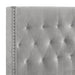The Huxley Upholstered Bed in Gray combines contemporary glam with durable construction for a stylish and comfortable bedroom centerpiece. This set includes a headboard, footboard, two side rails, and a slat kit, all crafted from manufactured woods and eco-friendly decorative laminate for long-lasting use. The bed features clean lines and a crystal button-tufted headboard with silver studded trim, offering a touch of luxury and comfort. Its inviting finish provides a sleek, modern look that complements contemporary interiors, creating a sophisticated and calming atmosphere. The neutral tone pairs beautifully with the metallic accents and luxurious upholstered headboard, adding a touch of glamour and cohesion to the overall design. The 100% polyester velvet fabric exudes elegance with its soft feel and plush padding, ensuring maximum comfort.