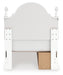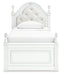 Fit for a princess. This twin upholstered panel storage bed’s crisp matte white finish pairs with charming ornate beading and sumptuous button-tufted upholstery—perfect for your girly girl. Spacious storage drawers neatly tuck away bedroom essentials. Decorative ball tops and multicolored LED lighting in the headboard are the crowning touches to make your little one feel like royalty.