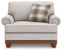Fresh yet classic. That’s the beauty of this oversized chair. Dressy and also soft to the touch, its organic neutral-toned upholstery is sure to bring a transitional farmhouse aesthetic to your living space. An accent pillow in windowpane plaid infuses a cozy and inviting farmhouse sensibility, while a full wraparound base and decorative turned legs complete the chair's timeless look. It's the perfect place to curl up after a long day.