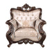 The Royal Classics Constantine Arm Chair in cherry combines heirloom craftsmanship with timeless design, making it a standout addition to any refined living space. Crafted from solid pine and detailed with premium polyurethane carvings, this chair offers a harmonious blend of beauty and durability. The lightweight yet robust carvings resist moisture, rot, and cracking, ensuring intricate details remain intact over time with minimal maintenance. The meticulous multi-step finish enhances the rich wood grain, while delicately burnished gold tipping highlights the ornate carvings, adding an extra layer of sophistication. Inspired by 18th-century Rococo design, this chair exudes regal elegance with its intricate ornamentation. The luxurious fabric blend, featuring elegant patterns and soft, sateen-like textures, not only elevates the chair’s visual appeal but also adds a comfortable, inviting feel. Crystal button-tufted backs and nailhead trims trace the graceful curves of the wood frame, offering exquisite attention to detail. Conveniently packed with unattached upholstery backs and bases, this chair is designed for easy transport and setup, making it an elegant and practical choice for your home.