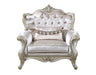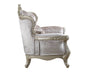The Monique Royal Classic Arm Chair showcases heirloom-quality craftsmanship and timeless elegance. Expertly constructed from premium pine solids and adorned with durable polyurethane carvings, this chair is lightweight, moisture-resistant, and pest-resistant, ensuring long-lasting beauty and functionality. The elegant 100% polyester velveteen fabric, adorned with a refined Fleur-de-Lis pattern, graces the crystal button-tufted backs and cushions. Complemented by a tasseled bolster pillow, this accent chair exudes luxurious sophistication. Traditional Victorian styling, with intricate detailing, ornate carvings, and plushly tufted backs, creates an elegant Victorian feel. Curved lines and elaborate design elements enhance its sophisticated look, making it a striking centerpiece for any living room. Indulge in opulent comfort with luxurious high-density foam backs and premium pocket coil cushions that offer unparalleled support and exquisite relaxation. For added convenience, the chair back is shipped unattached, allowing for easy maneuvering into your home, and can be securely assembled in just 15 minutes. This accent chair promises to elevate your living space with its refined style and comfort.