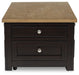 Details Made with acacia solids, acacia veneer and MDF substrate, Tabletop with light wood-tone finish, Dark chocolate brown body, Lift-top design, 4 smooth-gliding drawers, Casters for easy mobility