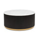 Elevate your living space with this elegantly modern cocktail group, designed to bring both sophistication and functionality to your home. Featuring a luxurious marble-inspired top, this group effortlessly exudes timeless elegance, while the sleek, vertically reeded base in a deep, refined hue adds a contemporary flair. The subtle yet striking gold-finished foundation enhances the upscale aesthetic, creating a perfect balance of opulence and understated charm. Smooth rolling casters on the coffee table make for easy reconfiguration. Whether placed together for a cohesive statement or used separately to complement your space, this set is the epitome of modern luxury and refined taste.