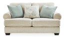 This loveseat strikes a beautiful balance between classic and current. Its traditional elements include t-cushion seating and setback roll arms, angled for modern flair. Posh pillows in spa mist and jacquard paisley make a muted, mellow complement to the loveseat’s casual textured chenille upholstery. And the choice of sandstone beige is a light and lovely style awakening.