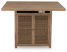A perfect balance of design and utility, this bar table with fire pit turns any outdoor living space into your own piece of paradise. Crafted with easy-care resin wicker over an aluminum frame with the look of wood, it's the epitome of California dreamin' style. The press of a button ignites a flickering flame that dances over a bed of glass beads. And with room for up to eight, it’s one highly accommodating table.