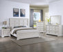Introducing a bedroom collection that brings a breath of fresh sophistication to any living space. This suite boasts a bright, antique white finish that immediately brightens and opens up a room, providing a versatile foundation for any decor style. The bed's commanding headboard stands as a stately centerpiece, with architectural paneling details that convey a sense of sturdy elegance. Storage needs are gracefully met by the dresser and chest, each accented with refined drawer pulls that offer a subtle contrast and easy access.