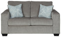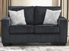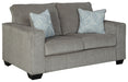 If style is the question, then this loveseat is the answer. Sporting clean lines and sleek track arms, the decidedly contemporary profile is enhanced with plump cushioning and a chenille-feel upholstery that's so pleasing to the touch. Sure to play well with so many color schemes, this loveseat in slate gray includes a pair of understated floral pattern pillows for fashionably fresh appeal.