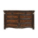 • Luxurious Finish: A rich mahogany brown multi-step finish highlights intricate burl inlays and antique gold carvings. The deep tones and elegant detailing create a timeless, luxurious look.
