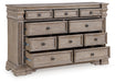 | Details | Made with hardwood solids, oak and ash veneer, cast resin components and engineered wood substrates, Top with inlaid ash veneer border, Light warm grayish brown glazed wood finish, Round metal knobs with satin nickel-tone finish, 10 drawers with fully finished interior, dovetail construction and ball-bearing side glides, Drawers with inset framed fronts, Breakfront pilasters | |