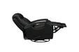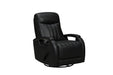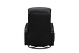 Modern open track arm design, 360-degree swivel glider recliner with handle activated recline. 4” channels on the seat & back, pad over chaise seating with pocketed coil springs, and plushily padded headrest and footrest for outstanding reclining comfort. Chrome accents under the arm pads and single needle top stitching thru out.