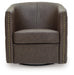 Details Faux leather upholstery, Barrel back and loose seat cushion, Metal swivel base, Nailhead trim with antiqued brass-tone finish, Tufted sides, 360-degree swivel