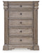 Details B916B5: Includes panel headboard, footboard with slats and rails, Made with hardwood solids, oak and ash veneer, cast resin components and engineered wood substrates, Tops with inlaid ash veneer border, Light warm grayish brown glazed wood finish, Breakfront pilasters, Inset picture frame panels, Headboard features light bridge with 2 overhead LED lights, Foundation/box spring required, sold separately , Mattress available, sold separately, Assembly required, B916B1: Includes dresser and mirror, Made with hardwood solids, oak and ash veneer, cast resin components and engineered wood substrates, Tops with inlaid ash veneer border, Light warm grayish brown glazed wood finish, Round metal knobs with satin nickel-tone finish, 10 drawers with fully finished interior, dovetail construction and ball-bearing side glides, Drawers with inset framed fronts, Dresser with breakfront pilasters, Mirror frame features light bridge with 2 mini LED lights, Mirror attaches to back of dresser, B916-46: Made with hardwood solids, oak and ash veneer, cast resin components and engineered wood substrates, Top with inlaid ash veneer border, Light warm grayish brown glazed wood finish, Round metal knobs with satin nickel-tone finish, 5 drawers with fully finished interior, dovetail construction and ball-bearing side glides, Drawers with inset framed fronts, Breakfront pilasters, B916-93: Made with hardwood solids, oak and ash veneer, cast resin components and engineered wood substrates, Top with inlaid ash veneer border, Light warm grayish brown glazed wood finish, Round metal knobs with satin nickel-tone finish, 3 drawers with fully finished interior, dovetail construction and ball-bearing side glides, Drawers with inset framed fronts, Breakfront pilasters, 110V power supply with dual USB charging ports, Power cord included; UL Listed,