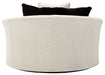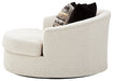Let it snow. Doubling your pleasure with a spacious seating area with room for two—or just you—this oversized round swivel chair in a snow-tone neutral invites you to stretch your style in an easy-elegant way. Whether your aesthetic is urban hip or suburban chic, this posh swivel chair is sure to look and feel right at home. Wrapped in a chunky heavyweight chenille fabric with a delightful touch, this fashion-forward chair includes designer pillows for a brilliant pop of color and texture.