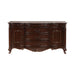The Royal Classics Constantine Sideboard / Server in cherry combines heirloom craftsmanship with functional elegance, making it a refined addition to any dining room. Expertly crafted from solid pine and premium fancy face birch veneers, this piece ensures lasting beauty and durability. The multi-step finish enhances the natural wood grain, while delicately burnished gold tipping highlights the intricate carvings, adding a touch of luxury to its design. Inspired by 18th-century Rococo style, the sideboard features ornate ornamentation and carvings that bring a sense of regal sophistication to your home. The genuine marble top follows the furniture's graceful curves, while bowfront drawers and cabriole legs complete its lavish look. For practical use, the sideboard offers three velvet-lined drawers for flatware, spacious open shelving behind doors for bulkier items, and additional drawers for table linens or hosting essentials—making it both elegant and versatile, perfect for organizing and showcasing in style.
