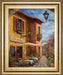 Step into the warm embrace of a sunlit European courtyard with this charming artwork. The scene captures a quaint café bathed in golden hues, where rustic architecture meets blooming florals under a bright blue sky. Framed in a gilded radiance frame, this piece brings a touch of timeless elegance and inviting ambiance to any living or dining space, inviting you to savor the simple joys of a peaceful afternoon.