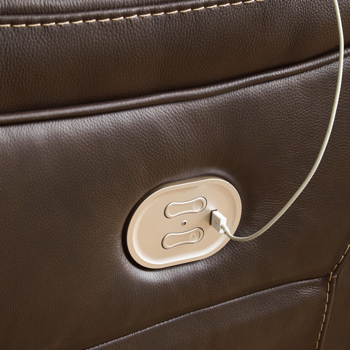 Load up on comfort in a cool, clean-lined and contemporary way with this power reclining loveseat in chocolate brown. Rest assured, the expertly matched leather and faux leather upholstery is enriched with a pebble grain effect for authentic appeal and enhanced with jumbo stitching for dramatic contrast. It features a one-touch power control with adjustable positions, along with an Easy View™ adjustable headrest that allows a primo view of the TV even when you're reclined. Extended ottomans provide extra length for leg comfort. A zero-draw USB plug-in at your fingertips lets you charge up as you chill out.
