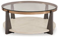 | Details | Made with solid wood, faux travertine laminate with MDF substrate and metal, Legs with grayish brown wood-tone finish, Metal frame with goldtone finish, Fixed lower shelf, Clear tempered glass tabletop, Assembly required | |