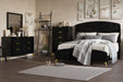 The Kailani Bedroom Set is a masterful combination of modern design, luxurious comfort, and sustainable craftsmanship, perfect for creating a sophisticated and inviting bedroom space. This set includes an upholstered panel bed, dresser, mirror, chest, and two nightstands, all expertly crafted from a durable blend of solid rubberwood, engineered wood, and eco-friendly decorative laminate. The construction ensures long-lasting beauty with superior resistance to scratches, moisture, and stains, making maintenance a breeze. The modern minimalist design features clean lines, a sleek silhouette, and chic ribbed textures, complemented by slim metallic handles and tapered legs that enhance the contemporary aesthetic. The bed, wrapped in plush 100% Polyester Velvet, exudes warmth and sophistication, with a generously padded headboard ideal for relaxation. The matching furniture, with its textured drawers highlighted by gleaming gold pulls and angled legs, adds a touch of glamour to the set, making it a standout in any bedroom. The spacious drawers are designed for seamless functionality, featuring fully finished interiors, full-extension slides, and durable dovetail joinery for smooth, snag-free storage and lasting strength. With easy assembly, requiring just 60 minutes to set up the bed and secure the casegood legs and drawer pulls, the Kailani Bedroom Set offers both style and convenience, making it a perfect addition to any modern home.