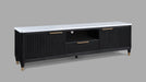 This entertainment console brings modern luxury and sleek sophistication to any living space. Featuring a striking contrast, fluted wood facade with a pristine faux marble top, this piece embodies refined elegance. Brass-tone accents and tapered legs add a touch of mid-century flair, enhancing its chic, upscale appeal. With generous storage space behind its textured doors and an open center shelf for easy access to media components, this console is as functional as it is stylish. Ideal for contemporary interiors, it’s the perfect blend of high-end design and everyday practicality, making it a standout addition to your home decor.